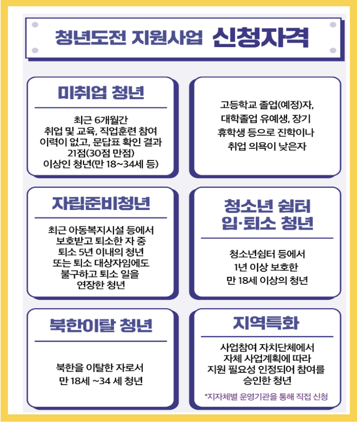 - 구직단념 청년: 6개월 이상 취업 및 교육(직업훈련) 참여 이력이 없고 구직단념청년 문답표 21점(30점 만점) 이상 인 청년(만 18세~34세 등)