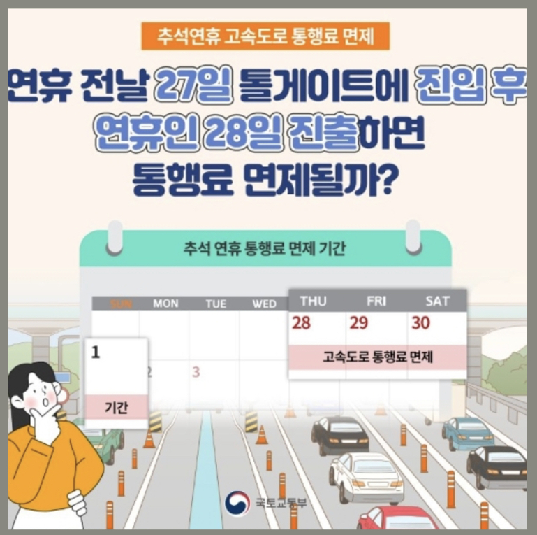만약에 연휴 시작 전날인 9월 27일(수)에 톨게이트에 진입하고 9월 28일(목) 진출해도 추석 연휴 시작인 9월 28일에 진출할 경우에는 진출한 것을 기준으로 통행료가 면제됩니다.