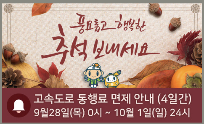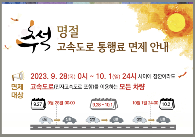 연휴 기간인 9월 28일~10월 1일에만 통행료 면제이며 10월 2일 임시공휴일과 개천절인 10월 3일은 정상 요금 수납되니 잘 체크하시기 바랍니다.