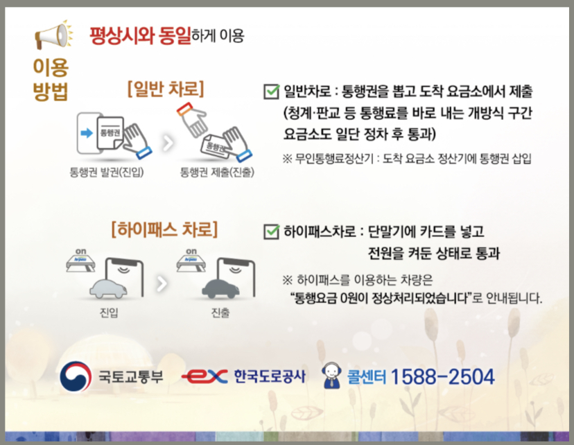 추석 연휴 기간동안 하이패스 이용자의 경우에는 하이패스 차로 통과 시 자동으로 통행료 0원으로 처리됩니다. 또한, 일반 차로 이용자는 고속도로 진입 요금소에서 통행권을 받아 진출 요금소에 통행권을 내면 면제 처리됩니다.