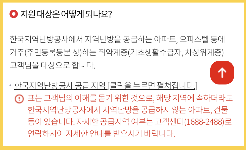 한국지역난방공사에서 지역난방을 공급하는 아파트, 오피스텔 등에 거주(주민등록등본 상)하는 취약계층(기초생활수급자, 차상위계층)이 대상입니다.