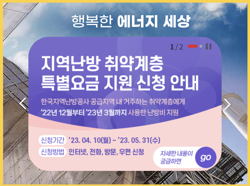 한국지역난방공사는 4월 10일부터 기초생활수급자와 차상위계층 가구를 대상으로 하는 ‘지역난방 특별요금 감면 제도’의 신청과 접수를 시작합니다. 그럼 취약계층 난방비 지원 신청방법 한국지역난방공사 홈페이지에 대해 알아보도록 하겠습니다.