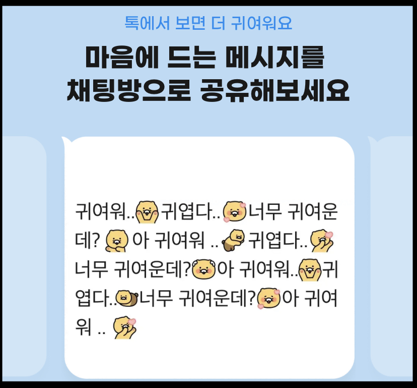 예) 춘식이 얼굴 미니 이모티콘에 춘식이 다리 미니 이모티콘을 조합하여 춘식이가 뛰어가는 모습을 구현하거나 텍스트 중간 중간 다양한 사물 미니 이모티콘을 포함시켜 텍스트를 재밌게 꾸밀 수 있습니다.
