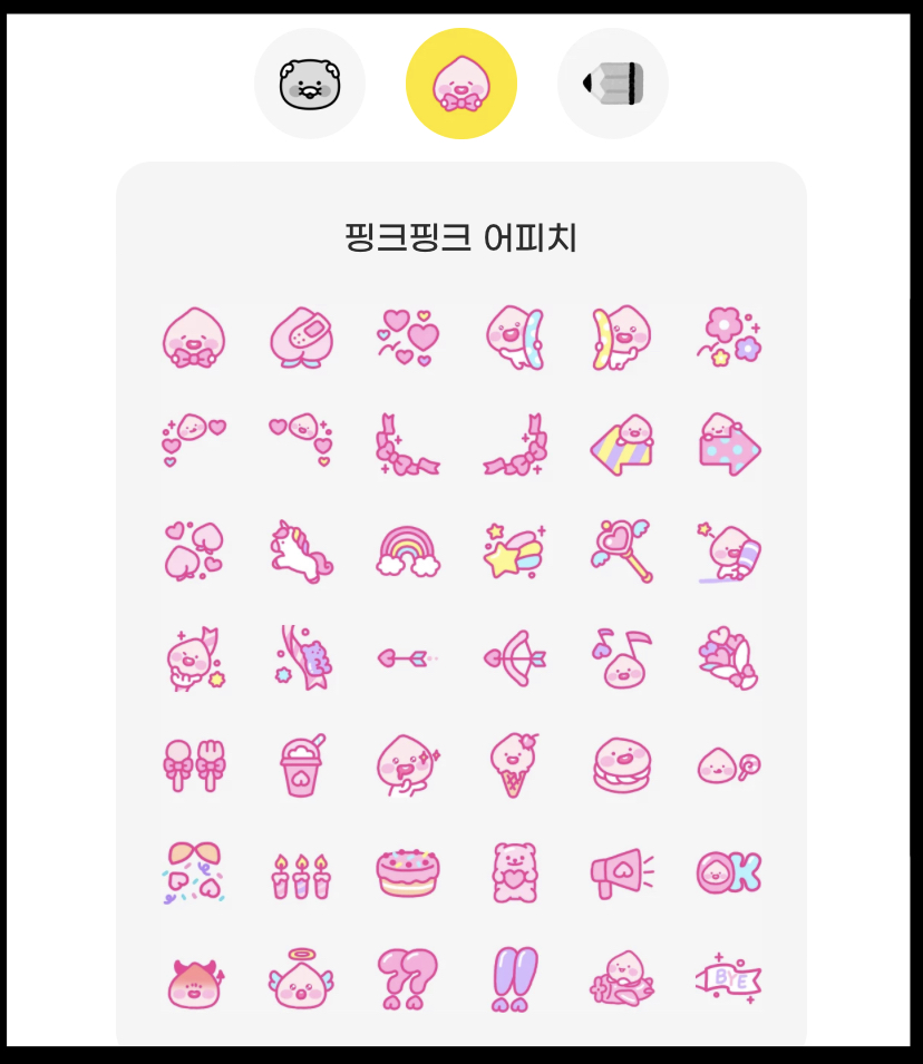 카카오에서 선보인 카카오톡 미니 이모티콘은 춘식이의 하루와 핑크핑크 어피치 그리고, 다양한 도구 이미지가 포함된 미니 문방구 등 총 3종입니다.