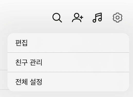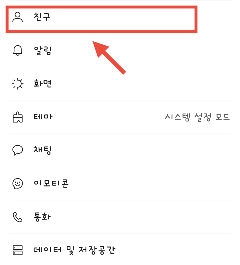 전체 설정 메뉴에서 ‘친구’ 항목을 선택합니다.