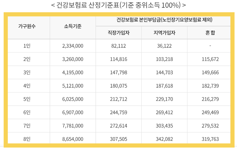 - 소득기준 확인: 격리여부와 관계없이 산정된 가구원 전체의 건강보험료 본인부담금(노인장기요양보험료 제외) 합산액이 산정기준표의 건강보험료 금액 이하인 경우 지원합니다.