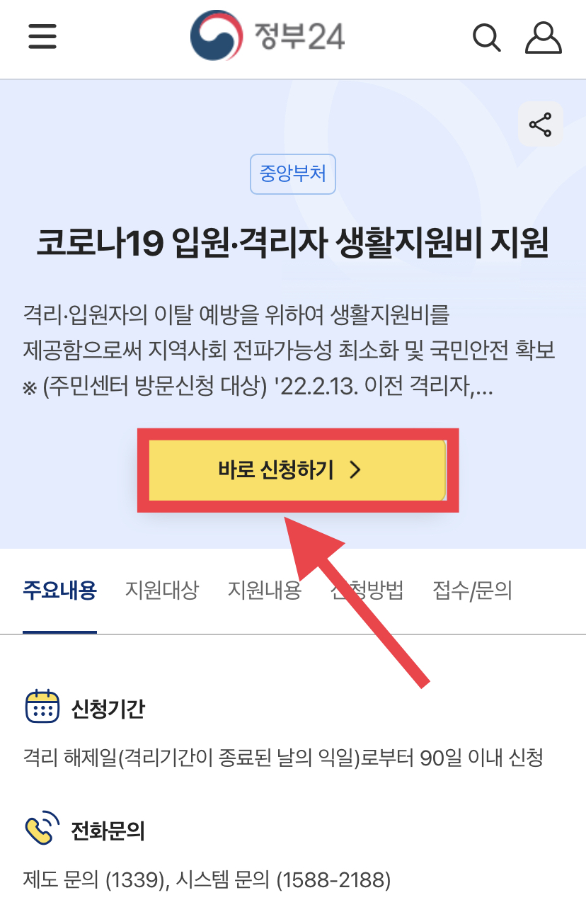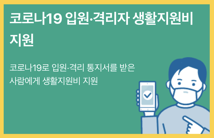 - 신청대상: 코로나19로 입원‧격리 통지서를 받은 사람입니다.