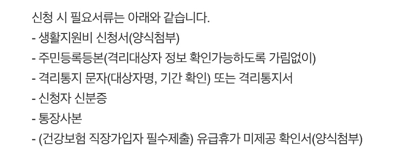 - 신청서류: 생활지원비 신청서, 격리대상자 본인 통장(사본), 신분증, 소득기준을 확인할 수 있는 서류(건강보험료 납부확인서 등), 위임장(대리인이 신청하는 경우), 예외 신청사유 증빙서류(유급휴가 미제공 확인서 등)입니다.