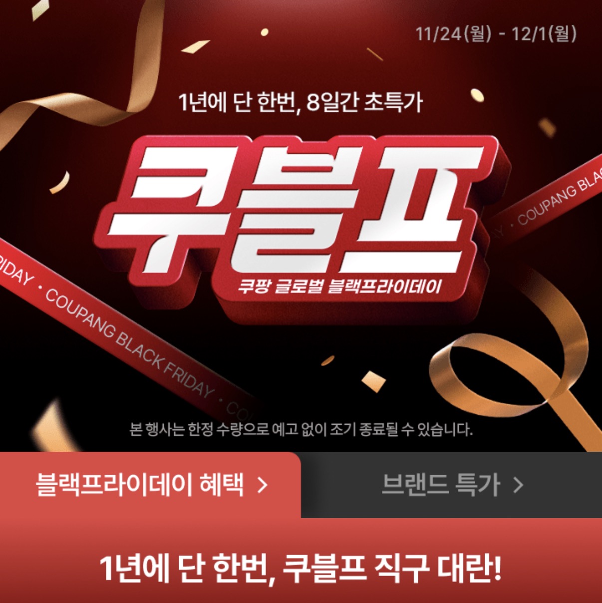 2025년 쿠팡 블랙프라이데이 행사(브랜드명으로는 ‘쿠블프(쿠팡 블랙프라이데이)‘는 2025년 11월 24일 부터 12월 1일 까지 진행됩니다.