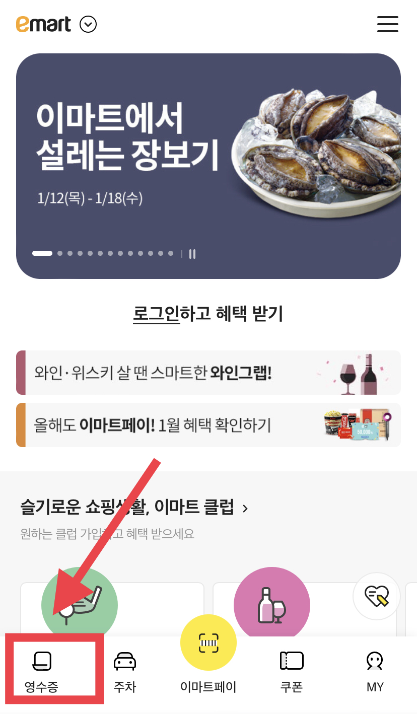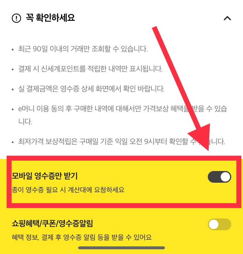 이마트 앱 > 로그인 하기 > 메인화면 왼쪽 하단 맨 아래 영수증 클릭 > 모바일 영수증만 받기 설정 완료
