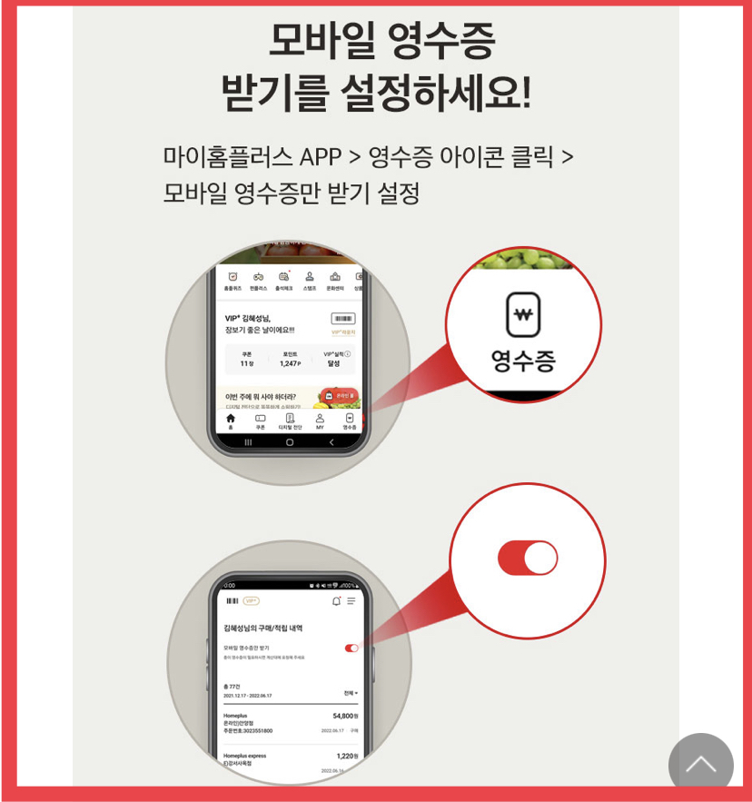 마이홈플러스 앱 > 로그인 > 하단 오른쪽의 영수증 아이콘을 클릭 > 모바일 영수증만 받기 설정 완료