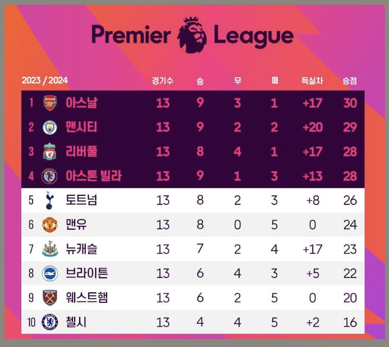 맨시티는 현재 케빈 더 브라위너 선수가 없는 상황인데도 불구하고 엘링 홀란드 선수가 버티며 2위를 기록중입니다.