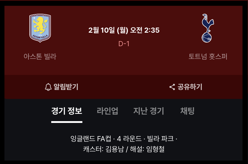 토트넘과 아스톤빌라의 FA컵 경기는 쿠팡플레이를 통해 시청할 수 있습니다. 김용남 캐스터와 임형철 해설위원이 중계합니다.