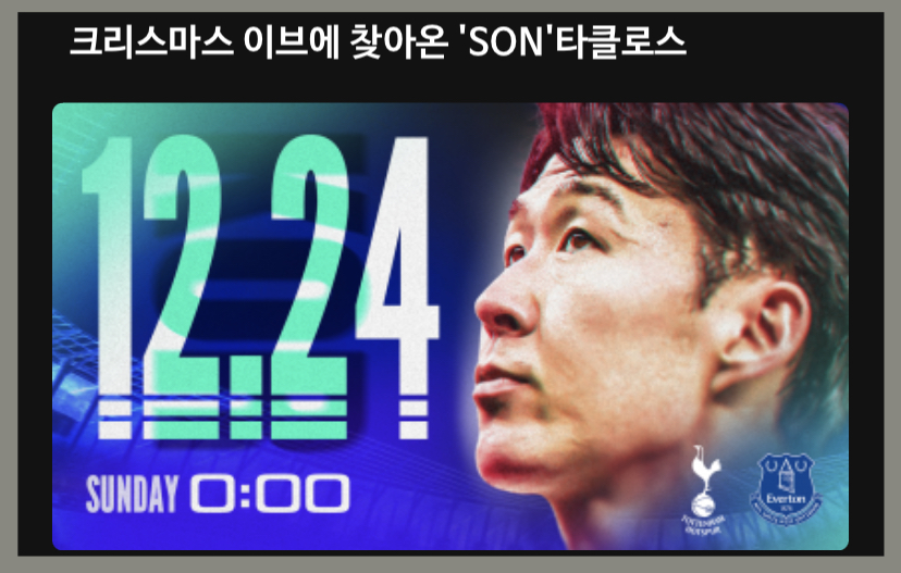 5년 전 12월 24일 크리스마스 이브에 열린 에버턴전은 손흥민 선수에게 손타클로스라는 수식어가 붙은적이 있습니다. 손흥민 선수는 2골 1도움을 기록하는 활약으로 팀의 4골 차 대승을 이끌며 경기 최우수선수로 뽑혔었습니다. 당시 EPL 사무국은 트위터를 통해 손흥민의 활약을 전하면서 손흥민과 산타클로스를 합친 손타클로스라는 표현을 쓰기도 했는데요. 이번 경기에서도 꼭 활약하는 손흥민 선수의 모습을 보고 싶네요.