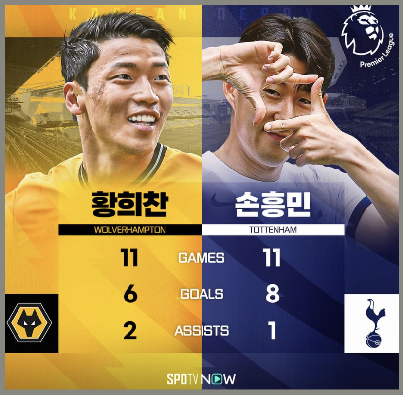 손흥민 선수는 EPL 통산 111골을 기록 중인데요. 이번 시즌 황희찬 선수의 울버햄튼과 펼치는 첫 코리안 더비에서 또 어떤 기록을 세우게 될지 궁금해집니다.