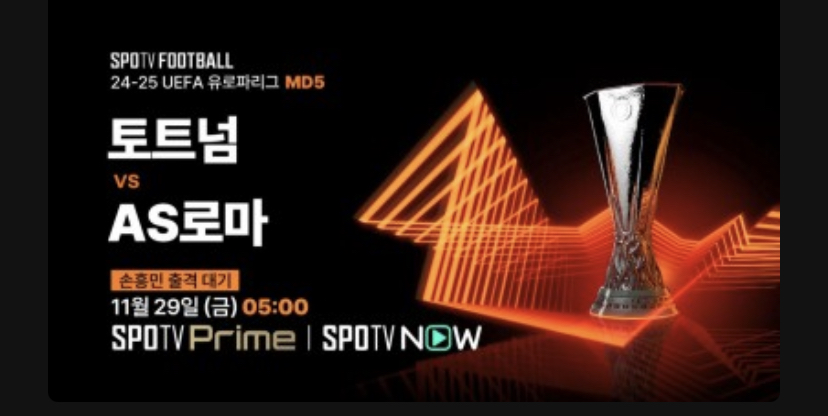 토트넘과 AS로마 경기에서는 단연 손흥민 선수의 유로파리그 활약이 기대되는데요. 경기 일정은 11웡 29일 금요일 새벽 5시 킥오프됩니다.