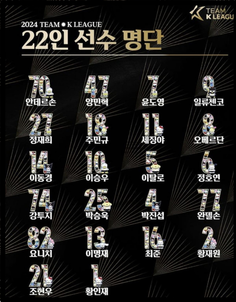 K리그 코칭 스태프가 선정한 픽텐에는 공격수 안데르손(수원FC), 일류첸코(서울), 윤도영(대전), 정재희(포항), 미드필더 이탈로(제주), 수비수 강투지(강원), 박승욱(김천), 요니치(인천), 이명재(울산)가 이름을 올렸다. 골키퍼는 황인재(포항)가 선발되면서 팀 K리그 골문을 지킬 예정입니다.