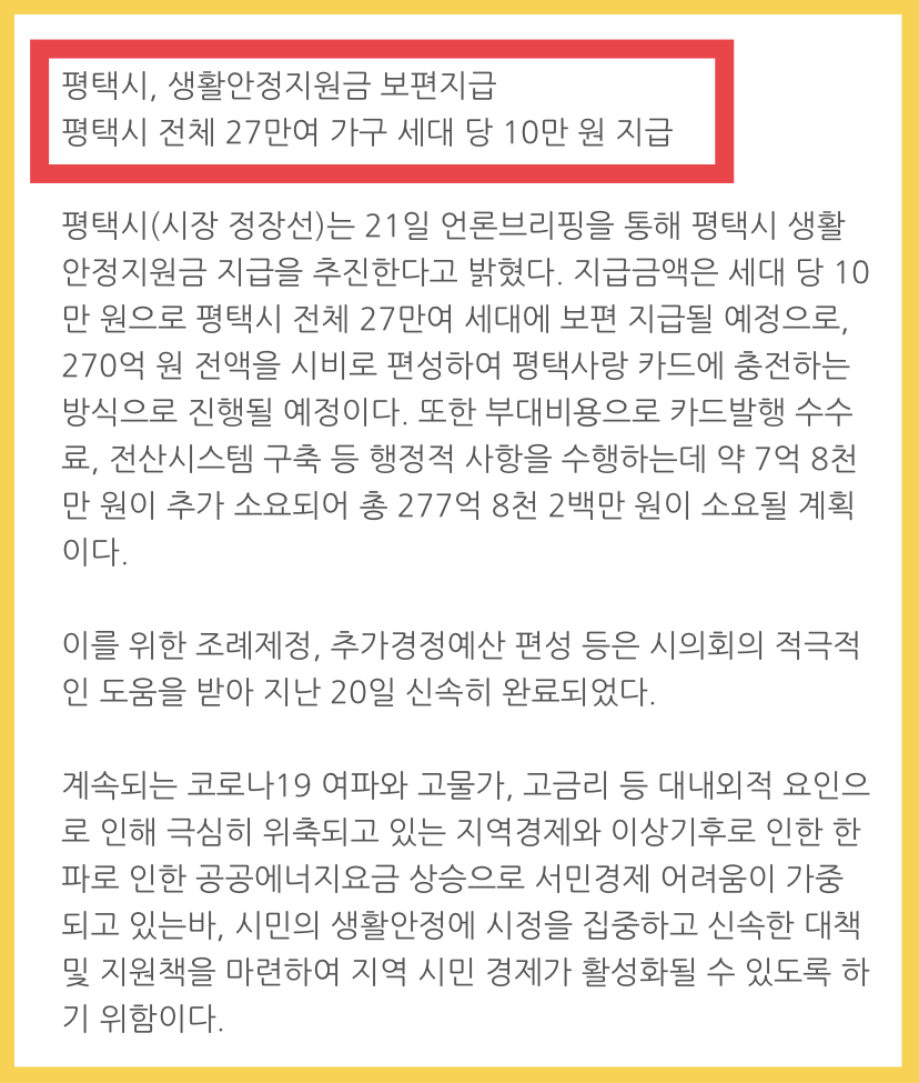 이것으로 평택시는 평택시민분들의 난방비 부담을 완화하기위해 3월 쯤에 평택시의 27만 가구에 10만원씩의 긴급 생활안정지원금을 지원합니다.