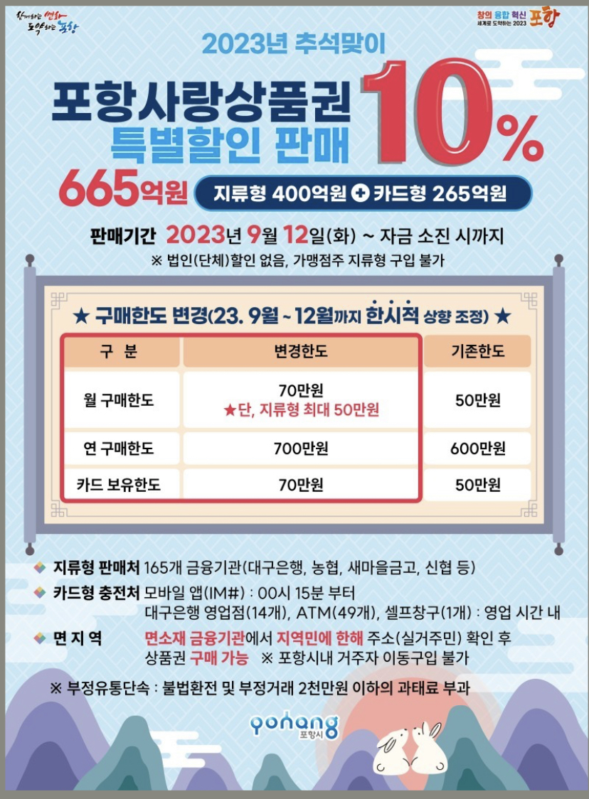 경상북도 포항시에서 10% 특별 할인 판매하는 포항사랑상품권은 추석을 앞두고 판매하는 행사입니다. 665억원어치를 10% 특별 할인 판매하는것으로 지류형은 400억원, 카드·모바일형은 265억원어치를 판매하는데 9월 12일부터 판매가 시작되었습니다.