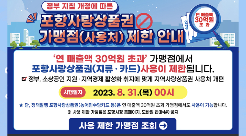 또한, 대규모 점포 백회점과 대형마트 그리고 기업형 슈퍼마켓 등에는 사용할 수 없습니다. 좀 더 구체적인 사용처는 포항사랑상품권 홈페이지에서 확인이 가능하니 아래 링크에서 확인해 보시기 바랍니다.