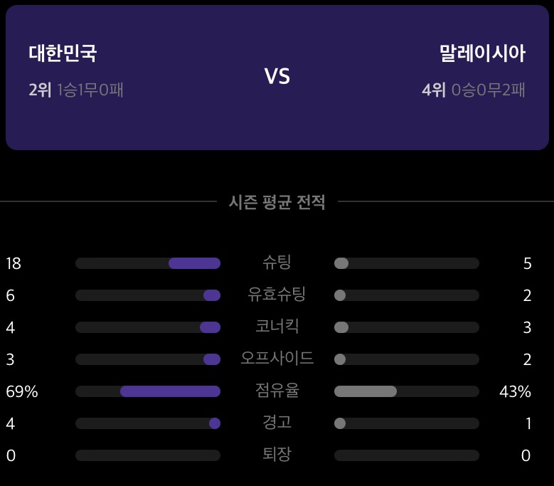 한국은 피파랭킹 23위이므로 말레이시아는 아래 전력으로 큰 이변이 없는 한 한국의 승리 가능성이 매우 높게 평가되고 있습니다.