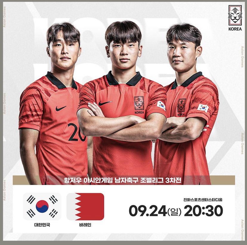 항저우 아시안게임 남자 축구대표팀은 9월 24일 밤 오후 8시 30분에 중국 진화시의 진화 스포츠 센터 스타디움에서 바레인과 E조 조별리그 최종전을 치르게 됩니다.