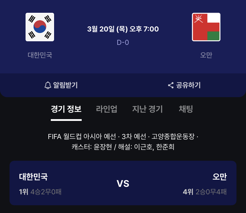 한국과 오만은 3월 20일 오후 8시 고양종합운동장에서 아시아 지역 3차 예선 B조 7차전 홈 경기를 치릅니드. 이어 3월 25일 같은 시각 수원월드컵경기장에서 요르단과 8차전을 갖습니다.