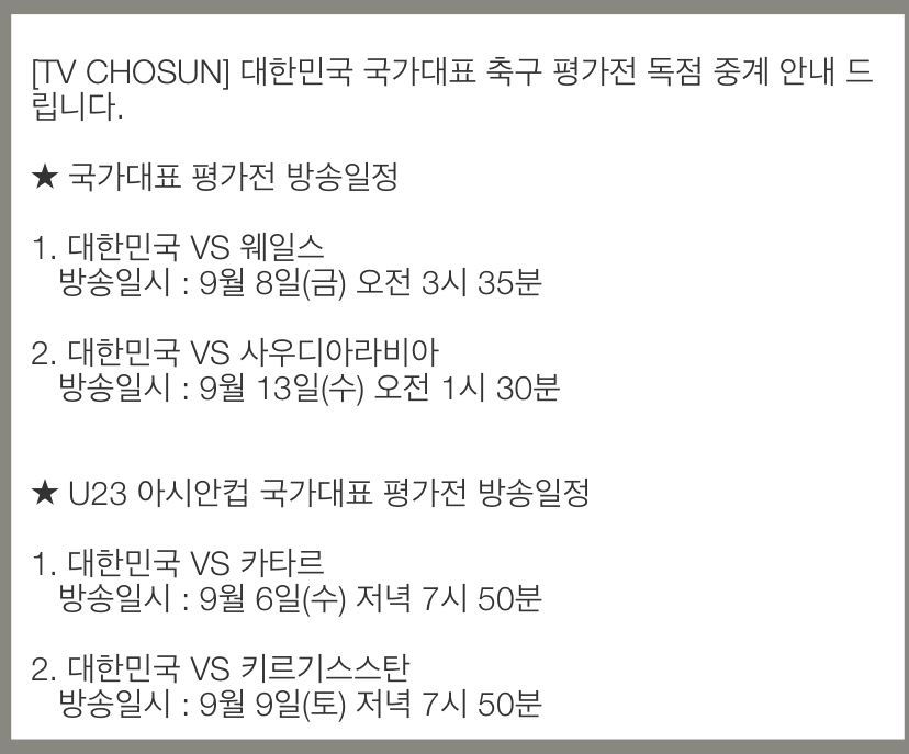 대한민국 축구 국가대표 유럽 원정 A매치의 실시간 생중계 방송은 TV조선과 쿠팡플레이를 통해서 무료로 시청하실 수 있습니다.