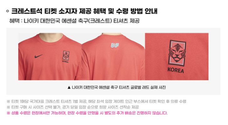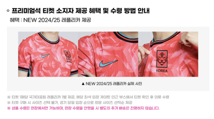 프리미엄석: 프리미엄석 구입자에게는 국가대표팀 레플리카 유니폼이 제공됩니다. 2인석인 프리미엄 테이블석은 레플리카와 뷔페도 제공됩니다.