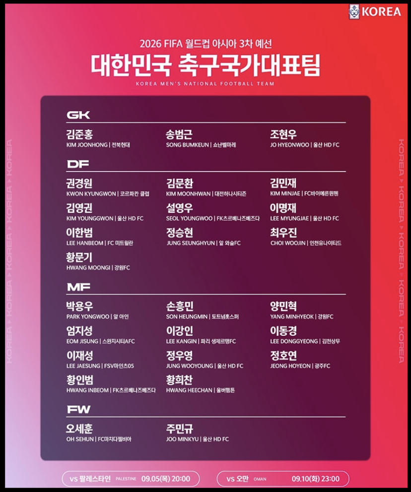 한국은 이번 9월 A매치 기간 팔레스타인과 홈 1차전에 이어 원정으로 오만과 2차전을 치릅니다.