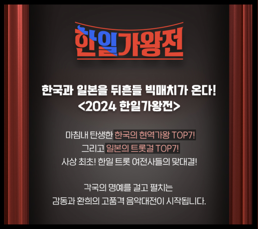 한국과 일본을 뒤흔들 빅매치가 옵니다. 2024 한일가왕전이 몇 부작인지 궁금하실텐대요. 한일 가왕전은 총 5부작이며 4월 30일에 종방을 합니다. 한일 가왕전 상금은 1억입니다.