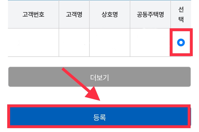 4. 고객번호를 등록해 줍니다. 현재 거주지에 대한 한전 고객번호를 조회하면 내가 거주하고 있는 주소가 나옵니다. 선택을 눌러주고 하단에 있는 등록을 해주면 됩니다.