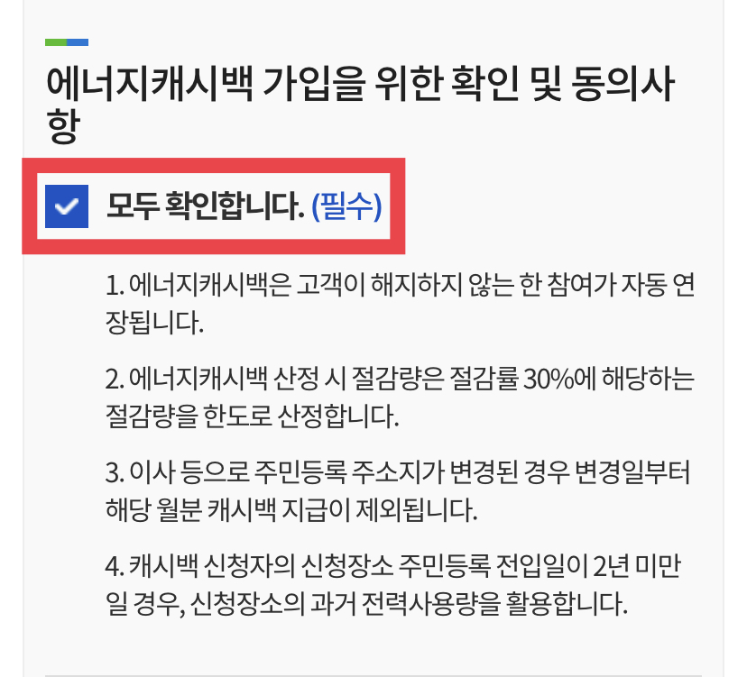 5. 에너지캐시백 가입 동의사항을 살펴본 뒤 모두 확인합니다를 체크하고, 에너지캐시백 참여 확인을 눌러줍니다.