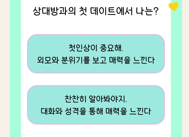 상대방과의 첫 데이트에서는 첫인상도 중요하지만 댛하를 천천히 하면서 매력을 느낍니다.