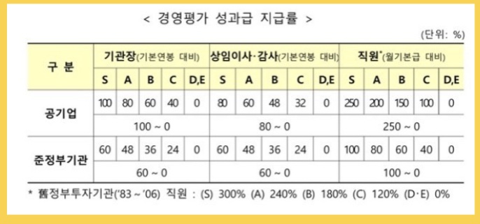 - 준정부기관 직업 성과급: 월기본급대비 S 100%, A 80%, B 60%, C 40%, D E 0%