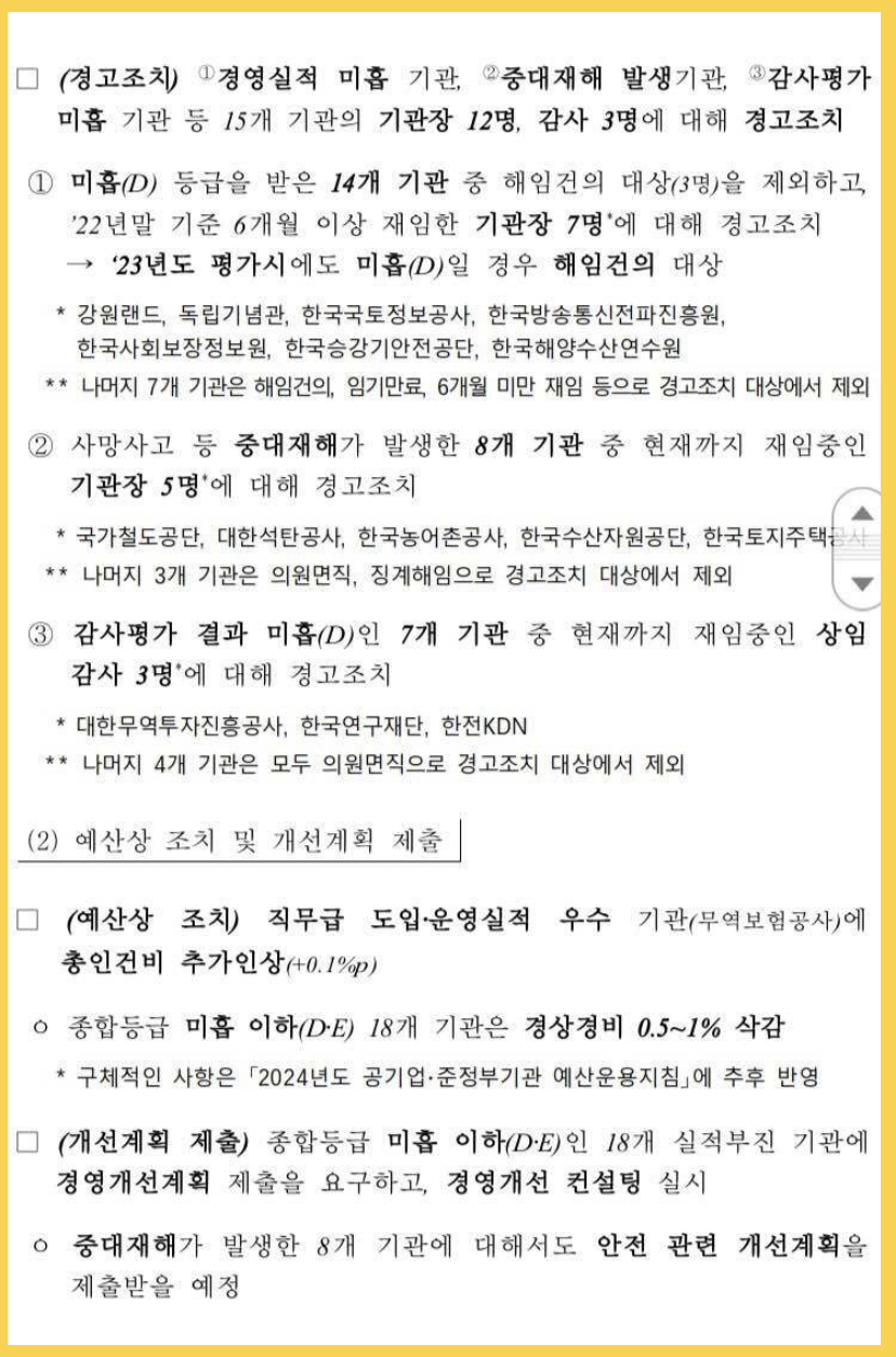 미흡D 등급을 받은 14개 기관 중 해임건의 대상인 3명을 제외하고, 22년말 기준 6개월 이상 재임한 기관장 7명인 강원랜드, 독립기념관, 한국국토정보공사, 한국방송통신전파진흥원, 한국사회보장정보원, 한국승강기안전공단,한국해양수산연수원에 대해 경고조치합니다. 23년도 평가시에도 미흡D일 경우에는 해임건의 대상이 됩니다.