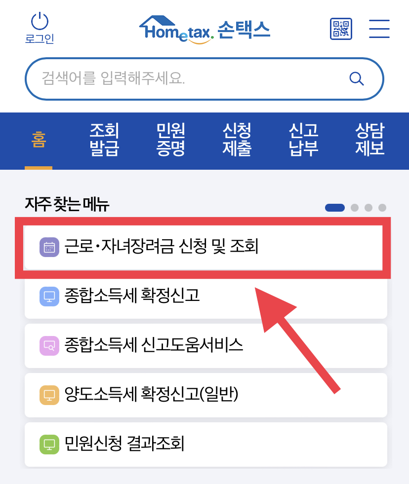 - 메뉴 중 근로,자녀장려금 신청 메뉴 클릭 후