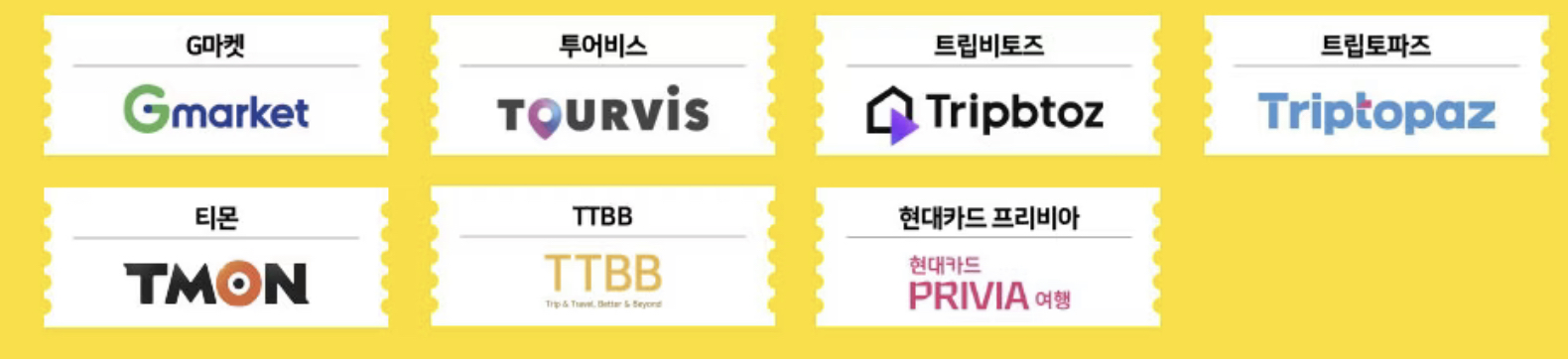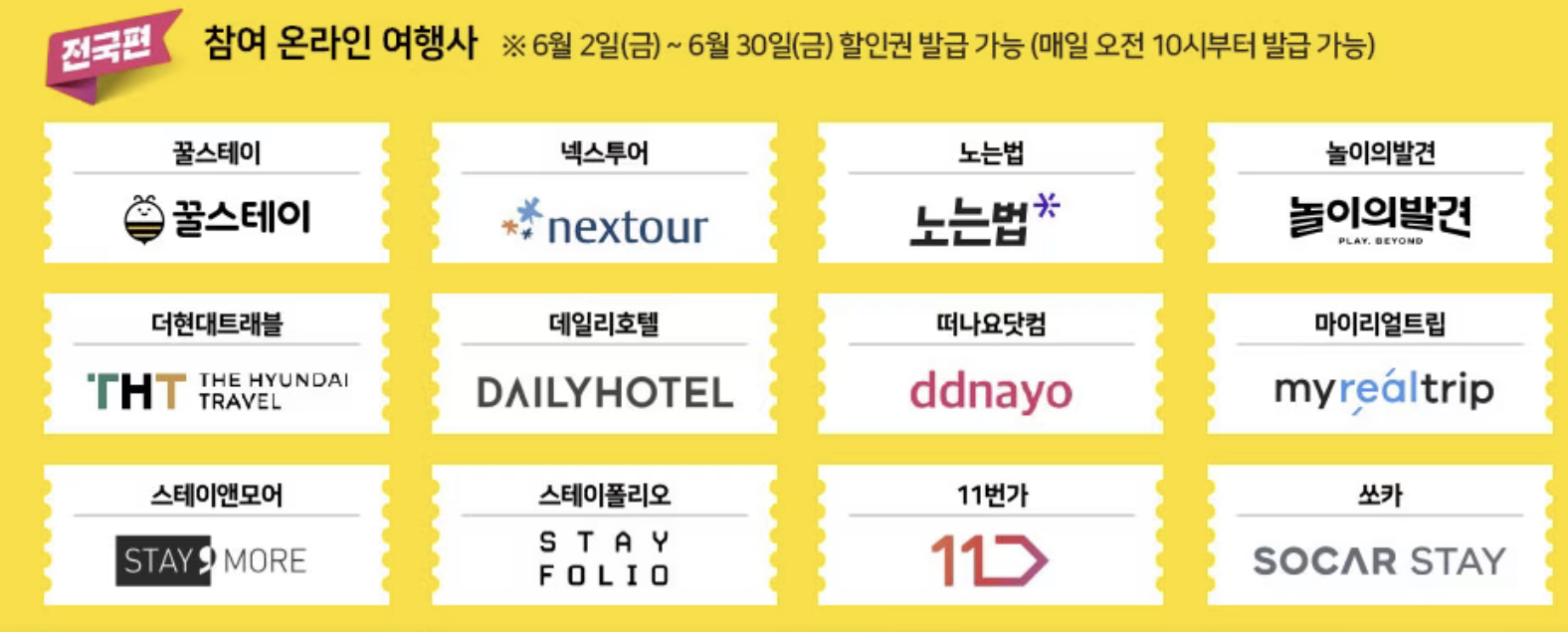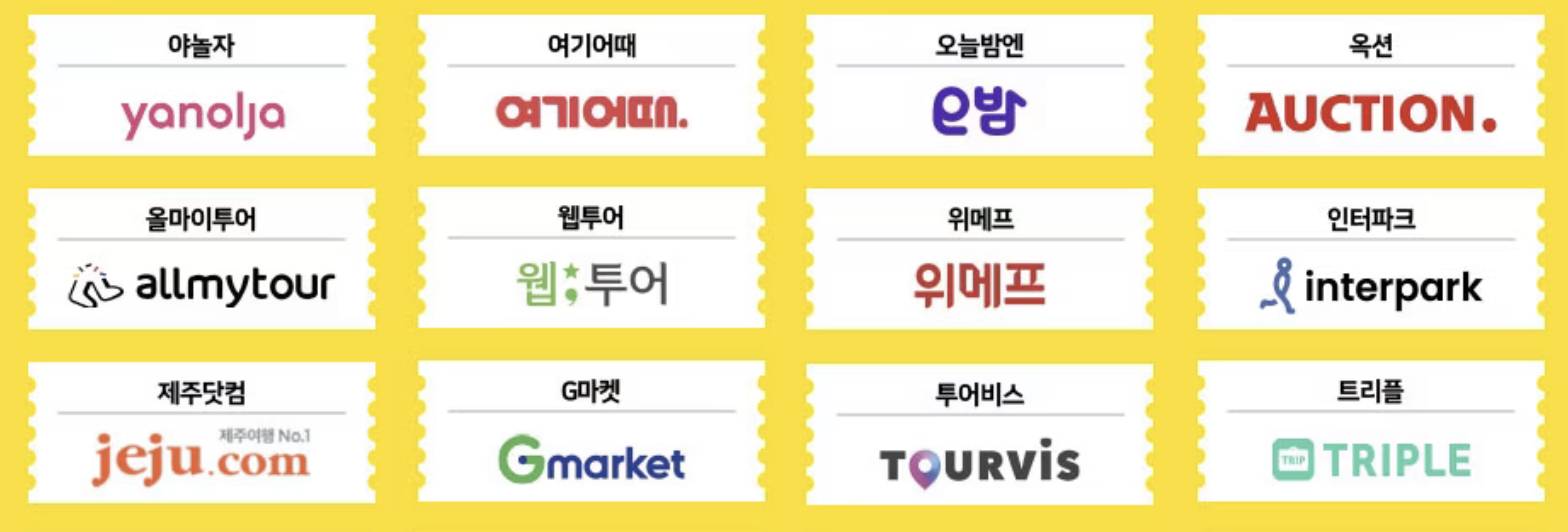 - 참여 온라인 여행사: 꿀스테이, 넥스투어, 놀이의 발견, 더현대트래블, 11번가, 쏘카, 야놀자, 여기어때, 웹투어 , 위메프 , 인터파크, G마켓, 투어비스, 티몬 등