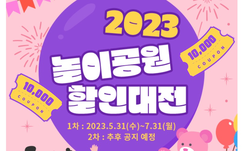2023 놀이공원 할인대전의 기간은 5월 31일부터 7월 31일까지 운영됩니다. 할인 내용은 3개 온라인 여행사인 여기어때, G마켓, 위메프를 통해서 전국 각지에서 운영되고 있는 유원 시설 입장권 상품을 구매할 경우 1만원 할인쿠폰을 제공드리는 것입니다. 할인권 사용 방법은 대한민국구석구석 누리집에서 자세한 내용을 확인하실 수 있습니다.