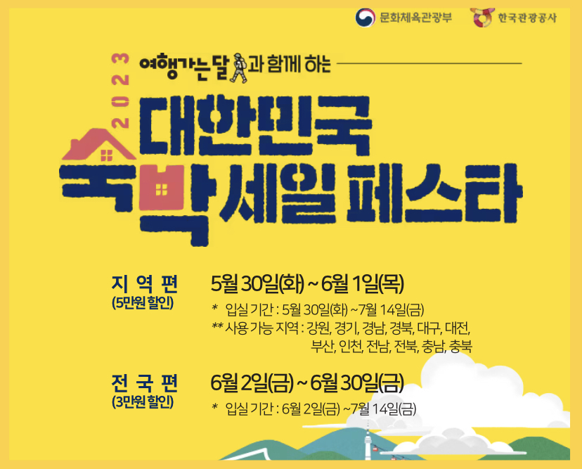 2023 대한민국 숙박 세일 페스타는 지역편과 전국편으로 나누어 진행됩니다. 호텔과 콘도, 모텔, 농어촌민박 등 국내 등록된 숙박시설을 대상으로 전체물량 100만장 중에 상반기에는 90만장을 배포되고, 하반기에는 10만장을 배포됩니다.