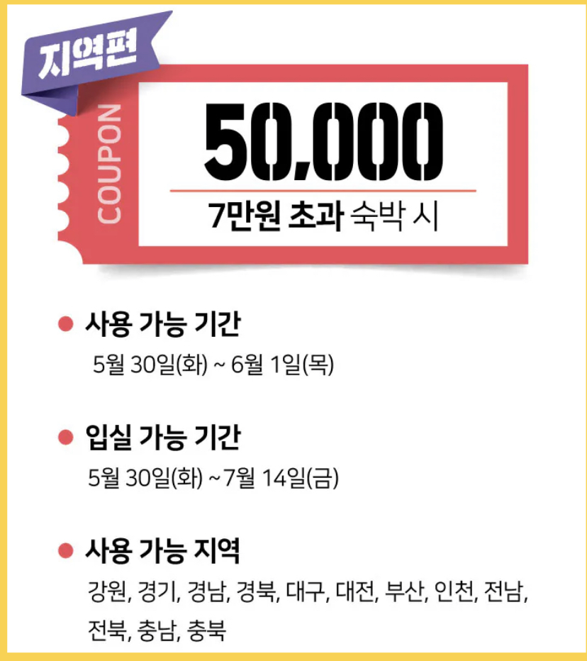 - 지원내용: 온라인으로 7만원 초과 숙박 상품 예약 시 5만원 쿠폰 제공. 12개 지자체 (경기·경남·경북·강원·부산·대구·대전·인천·전북·전남·충남·충북) 지역에 한정