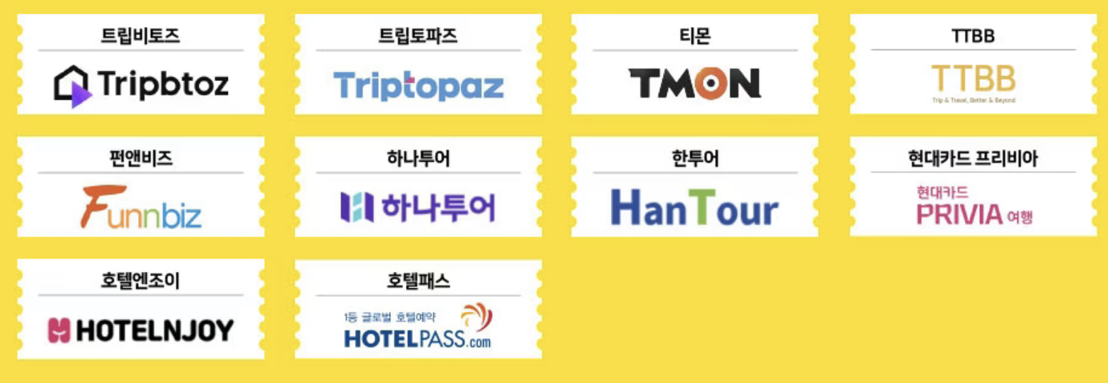 - 참여 온라인 여행사: 꿀스테이, 넥스투어, 노는법, 놀이의발견, 더현대트래블, 데일리호텔, 떠나요닷컴, 마이리얼트립, 스테이앤모어, 스테이폴리오, 11번가, 쏘카, 야놀자, 여기어때, 오늘밤엔, 옥션, 올마이투어, 웹투어, 위메프, 인터파크, 젲 닷컴, G마켓, 투어비스, 트리플, 트립비토즈, 트립토파즈, 티몬, 펀앤비즈, 하나투어, 한투어, 현대카드 프리비아, 호텔앤조이, 호텔패스