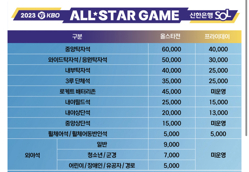 - 내야상단석: 올스타전 2만원, 프라이데이 1만3천원