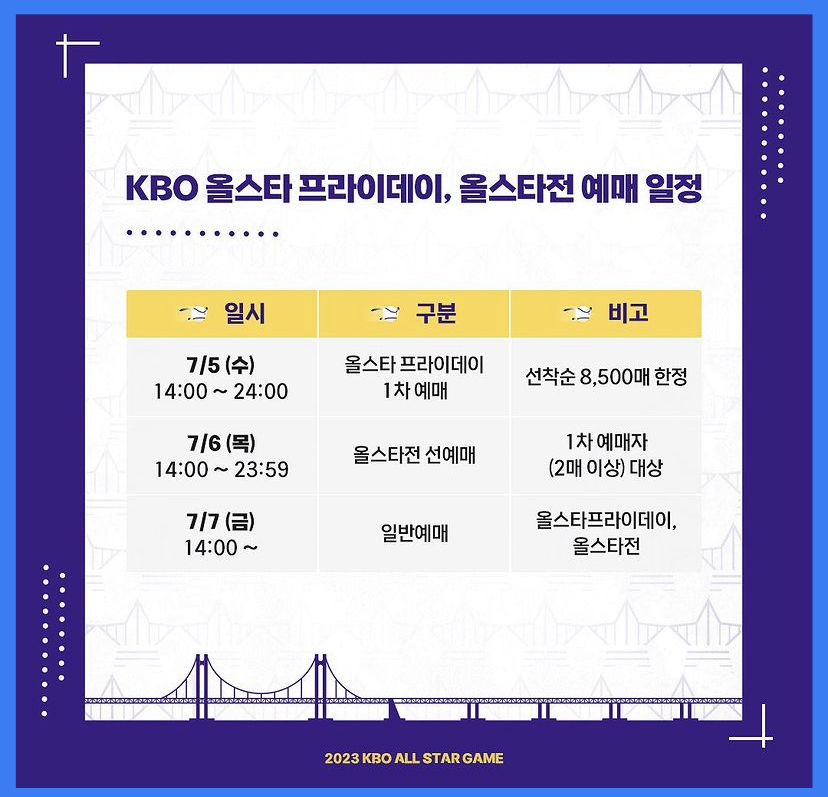 - KBO 올스타 프라이데이 1차 오픈 (선착순 8,500매 한정) 기간: 2023년 7월 5일 (수) 14:00 ~ 24:00