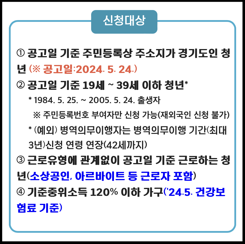 - 공고일 기준 주민등록상 주소지가 경기도인 청년 (※ 공고일:2024. 5. 24.)