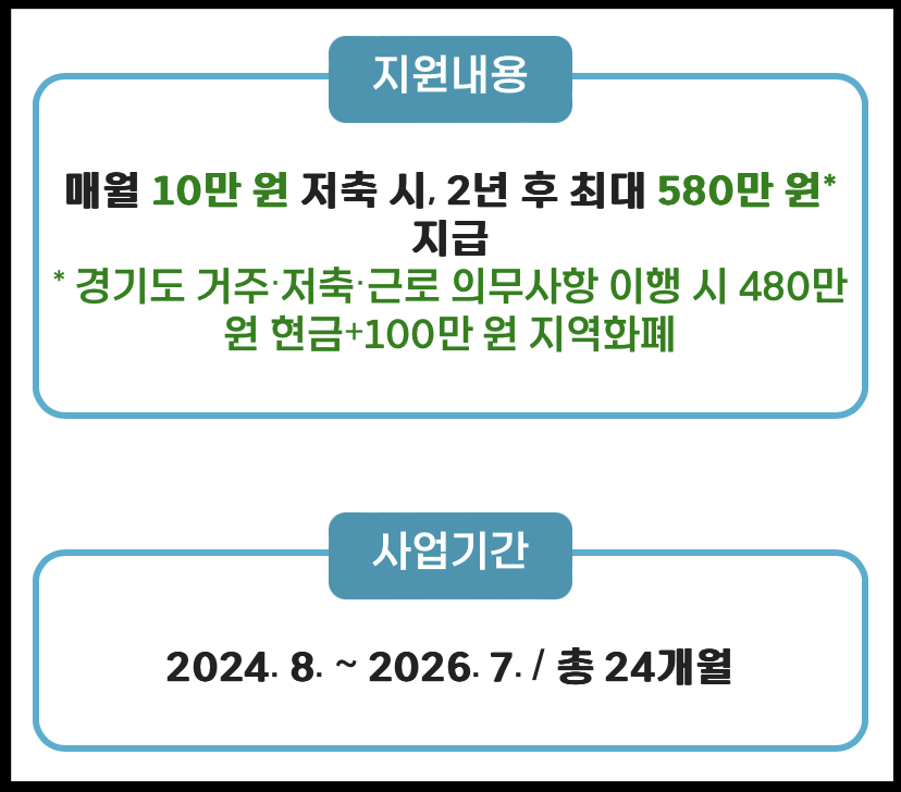 경기도 거주 청년이 매달 근로를 하며(소상공인, 아르바이트 등 포함) 매달 10만 원을 저축하면 2년 후 580만 원의 목돈을 만들 수 있는 통장입니다.