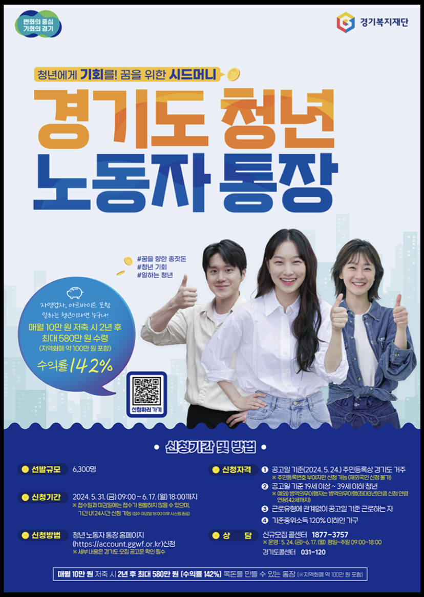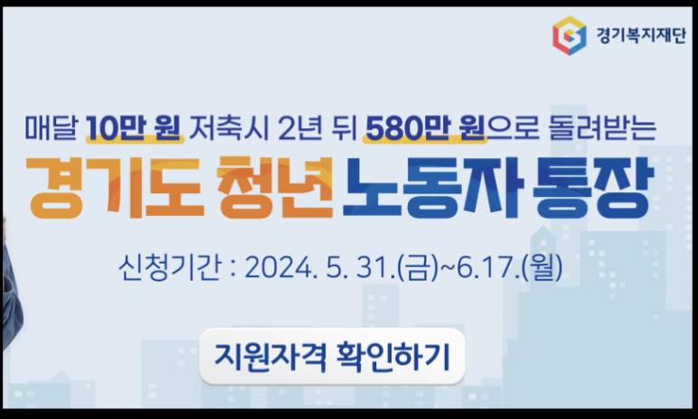 경기도 거주 청년이 매달 근로를 하며(소상공인, 아르바이트 등 포함) 매달 10만 원을 저축하면 2년 후 580만 원의 목돈을 만들 수 있는 통장입니다.