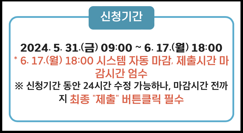 - 신청기간 동안 24시간 수정 가능하나, 마감시간 전까지 최종 제출 버튼클릭 필수입니다.