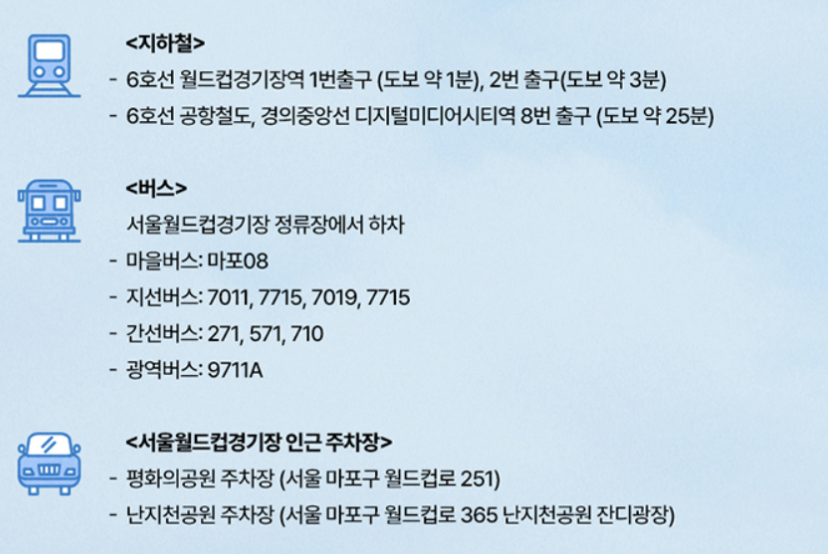 - 주소: 서울특별시 마포구 월드컵로 240 서울월드컵경기장