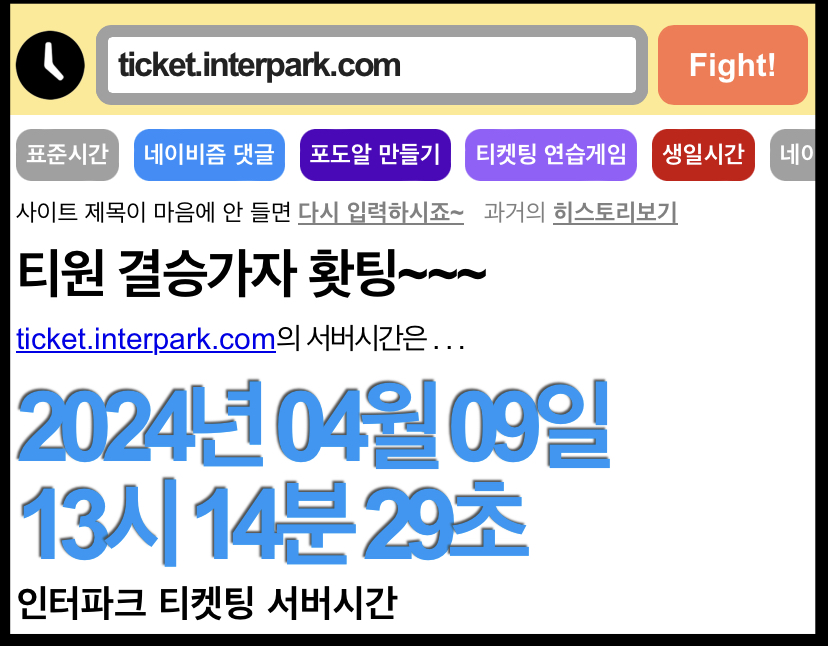 1. 서버 시간을 알려주는 사이트를 통해서 0.1초 단위 시계를 준비합니다. 서버 시간을 명확히 확인하는 것이 빠른 예매를 하는 데 도움을 줄 수 있습니다. (네이비즘, 타임시커 등)
